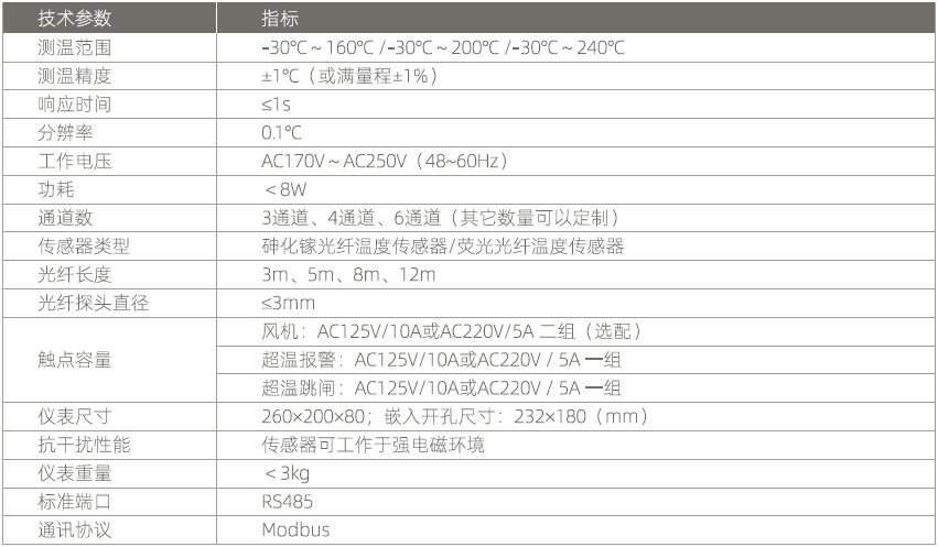 概述:TM-03干式变压器光纤温控仪是深圳阿珂法先进科技公司专为干式变压器实时在线温度监测研发的一款产品。具备多通道(A相、B相、C相、铁心温度测量)测温显示、报警联动输出功能。并可通过MODBUS协议与本公司其它产品配合使用,实现实时监控数据云端存储、转发等功能。 与传统干式变压器温控仪采用PT100温度传感器相比,本系统采用荧光光纤温度传感器/砷化镓光纤温度传感器,具有电磁免疫,绝缘性高等特点。