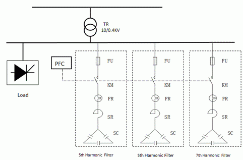 典型的谐波滤波器回路包含三种最为常见的谐波(5次、7次、11次)频率。谐波滤波器装在由钢板制成的柜壳内,每台滤波器包括电磁接触器、热继电器、电抗器、电容器和控制部分构成,通常谐波滤波器与主配电柜的馈线相连接。