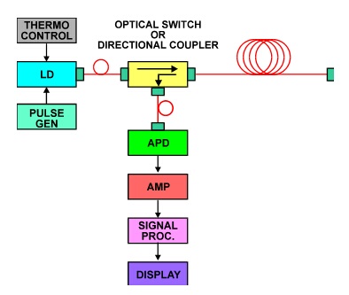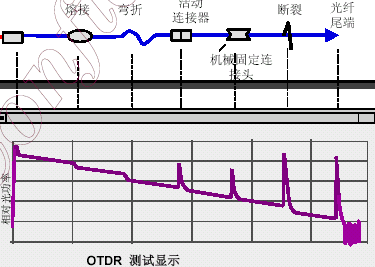 通过发射光脉冲到光纤内,然后在OTDR端口接收返回的信息来进行。当光脉冲在光纤内传输时,会由于光纤本身的性质、连接器、接合点、弯曲或其它类似的事件而产生散射、反射。其中一部分的散射和反射就会返回到OTDR中。返回的有用信息由OTDR的探测器来测量,它们就作为光纤内不同位置上的时间或曲线片断。
